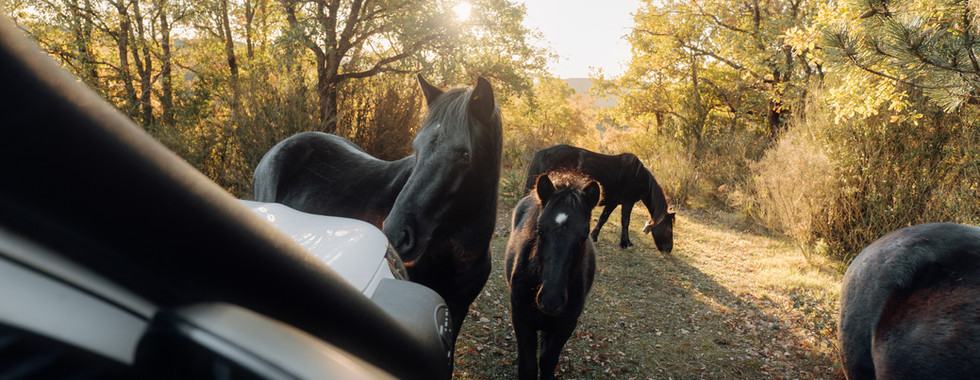 Der Morgen beginnt noch vor Sonnenaufgang. Kaum sind wir unterwegs, wird klar, dass dieser Tag einen ganz eigenen Charakter bekommen wird. Im ersten Licht des Tages tauchen plötzlich mehrere freilaufende Pferde neben der Strecke auf. Sie laufen ein Stück mit, kreuzen unseren Weg und verschwinden ebenso ruhig wieder in der Landschaft. Ein stiller, fast unwirklicher Start in den Tag.